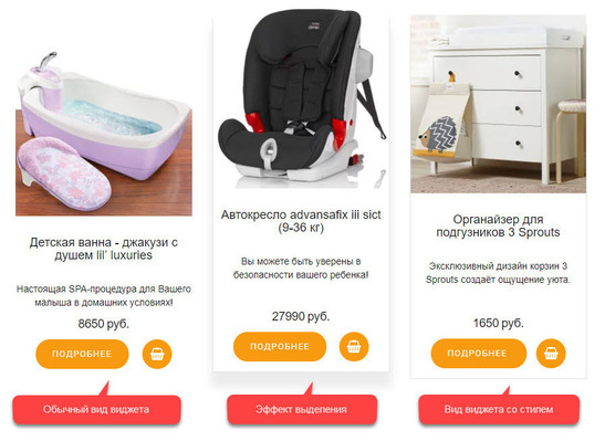 Скрипт укомплектован визуальным решением для виджета Товар магазина, изменяющего его облик, а также эффект выделения. Теперь карточки не будут сливаться с общим фоном страницы, а их внешний вид не будет отталкивать: