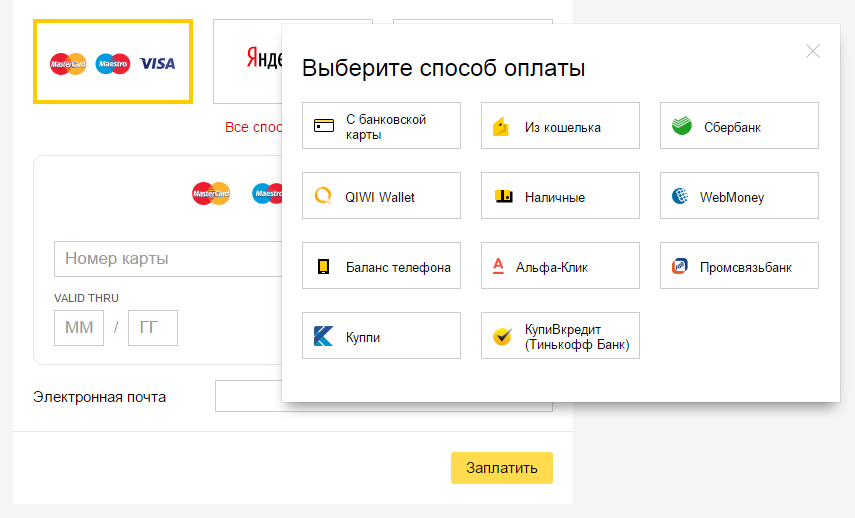 Способы оплаты в Яндекс.Кассе
